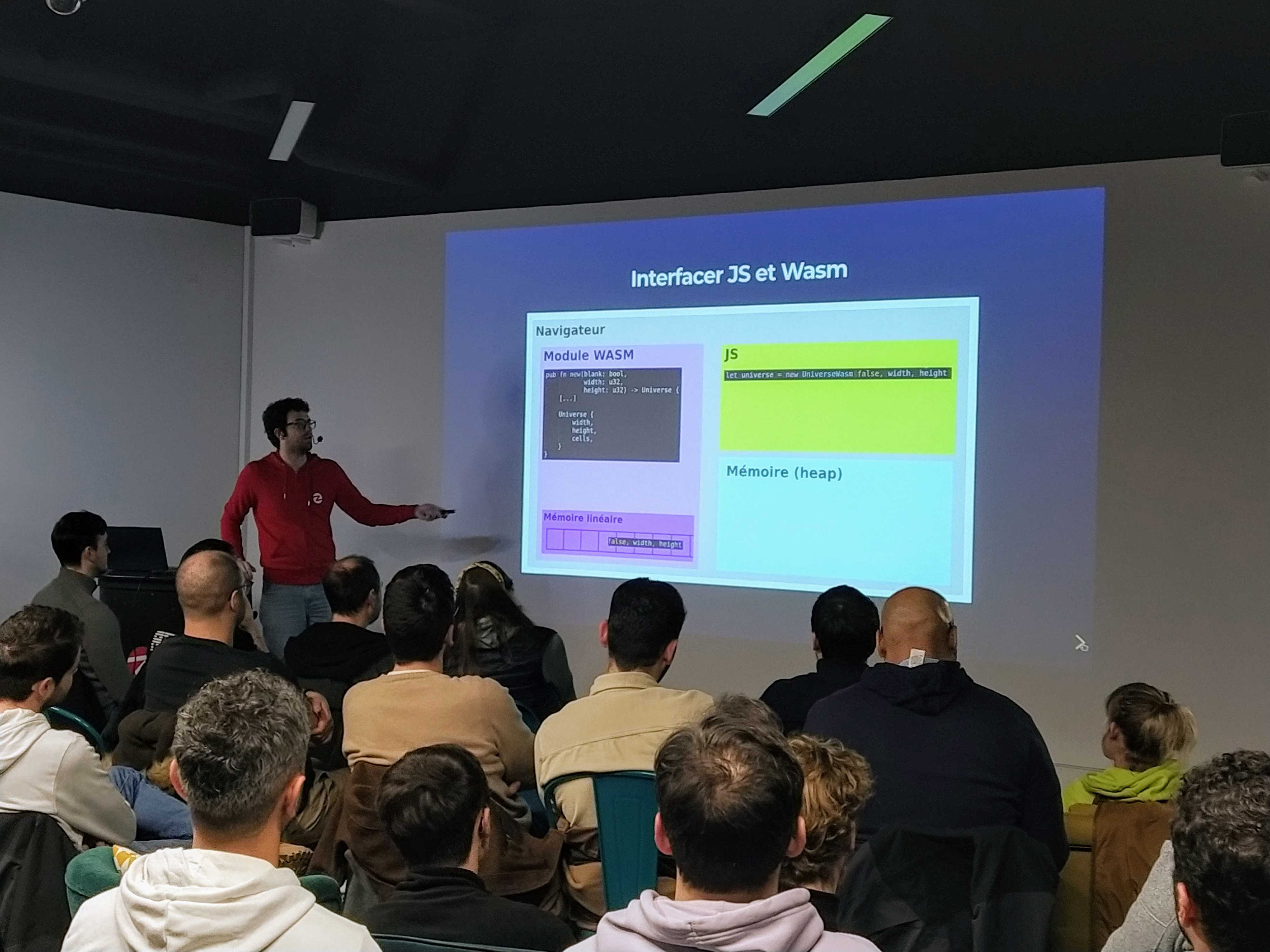 📣 TALK / "Comment j'ai trouvé le sens de la vie grâce à WebAssembly": Le jeu de la vie est un drôle de jeu qui a la particularité de n'avoir pas de joueur. Il se joue de lui-même et produit des configurations qui semblent évoluer de manière autonome, sans intervention extérieure. A partir de règles très basiques, des structures d'une très grande complexité peuvent émerger d'une manière qui évoque l'apparition de la vie sur Terre à partir d'éléments inertes, d'où le nom mystérieux de jeu de la vie. Comme ce jeu se joue idéalement sur des plateaux sans limite de taille, la question des performances de l'implémentation est capitale. Pour du développement web, cet exemple permet à la fois de voir les limites de JavaScript pour effectuer un grand nombre de calculs et de présenter une solution complémentaire à la réduction de la complexité algorithmique : une implémentation en WebAssembly qui permet de déléguer la charge de calcul à un langage compilé plus performant, Rust. L'objectif du talk est de présenter mon implémentation du jeu de la vie et comment je suis parvenu à optimiser ses performances grâce à cette technologie.